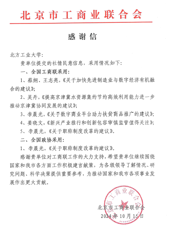 2024年10月16日,北京市工商业联合会发来感谢信,对365英国官网365英国上市公司官网投稿的“社情民意信息”被全国政协和全国工商联采用的情况进行通报并表示感谢。