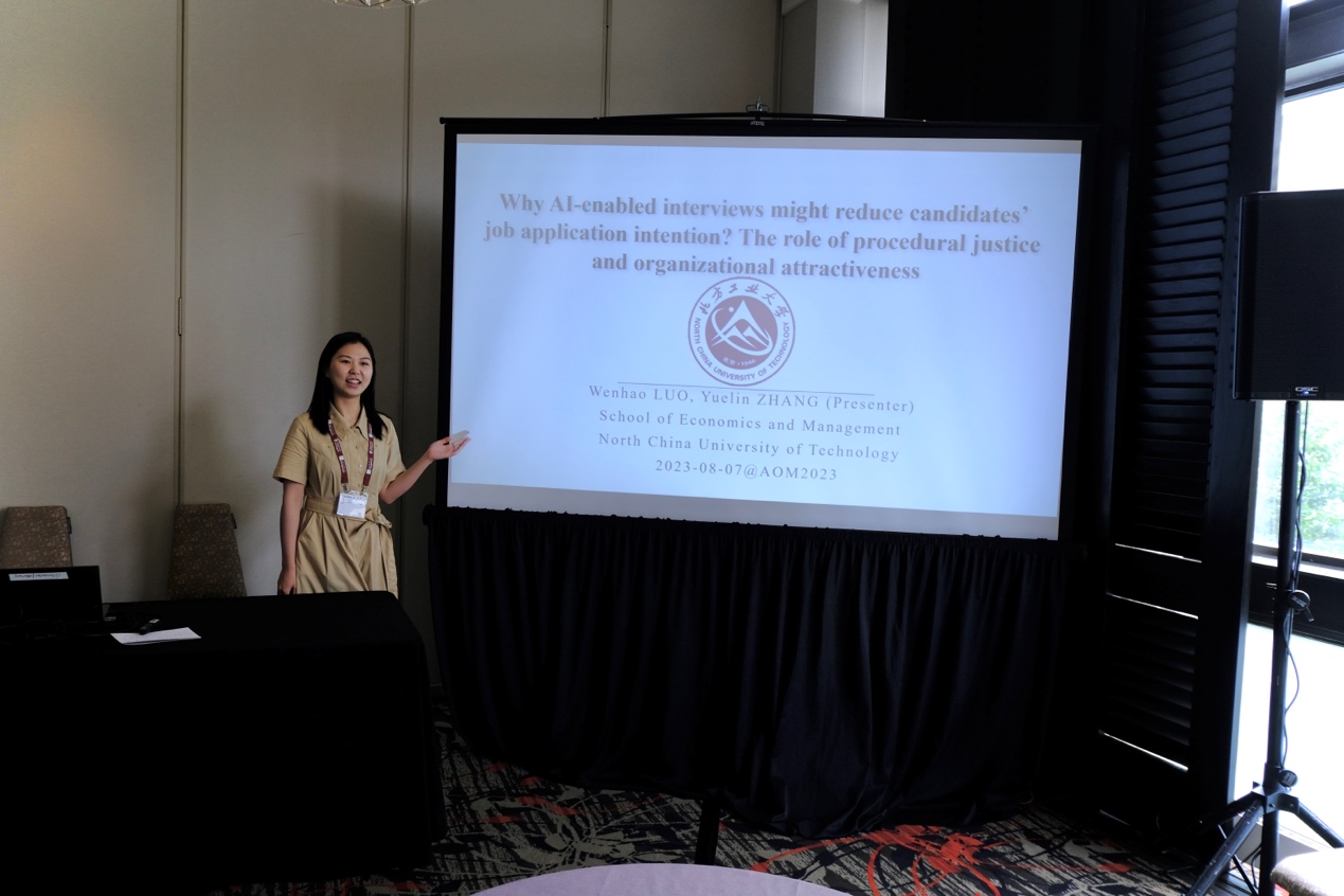 作为365英国官网首位在AOM这一管理学国际学术会议上报告研究成果的学生,张越琳同学事前充分准备,与导师进行了多次演练。参会中的认真展示得到了与会者的高度肯定,并收获了多名国际学者的建设性意见。该论文基于信号理论与公平启发理论,采用情景实验法,实证探究了AI面试对应聘者求职意愿的影响以及行业的调节效应。
