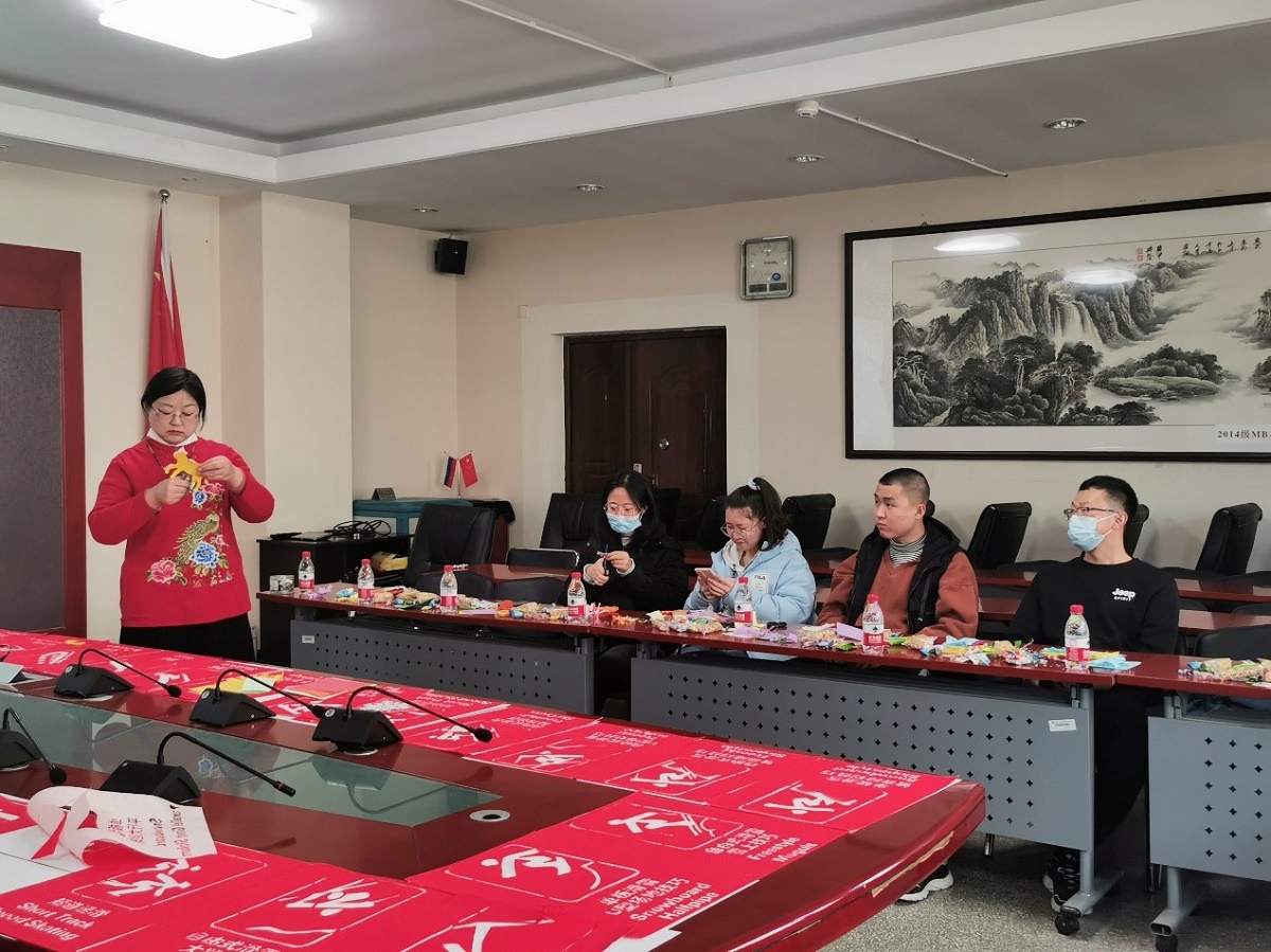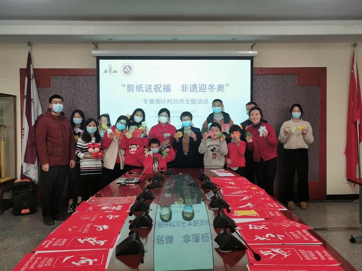 1月15日,在距离2022年北京冬奥会倒计时20天之际,365英国上市公司官网特举办主题为“剪纸送祝福 非遗迎冬奥”冬奥倒计时20天主题活动暨留校学生迎新春活动,活动得到了石景山区非物质文化遗产保护中心的大力指导与支持。学院党委副书记赵洁、辅导员吴芳、张泽圣以及留校的冬奥志愿者一同参与了此次活动,石景山区剪纸第四代非遗传承人杨秀英老师应邀参加了此次活动。