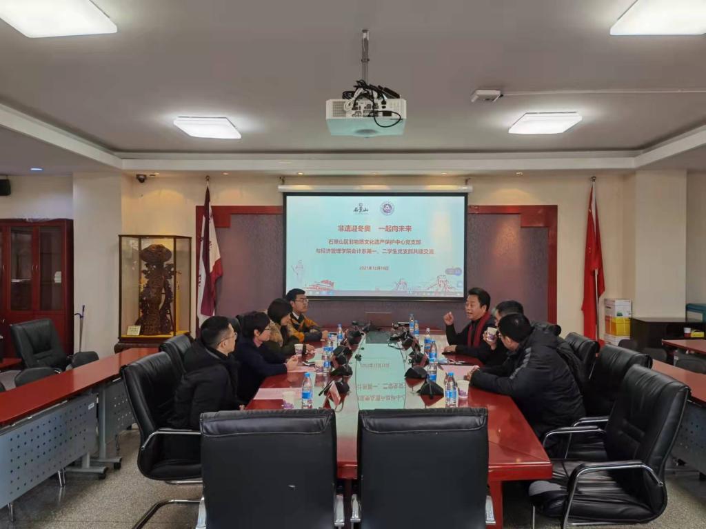 在展非遗、颂情怀、强自信活动环节,自12月13日至12月17日,在励学楼117室进行为期一周的石景山区非遗项目展示,帮助在校师生了解身边的非遗,感受非遗的魅力。现场展示既有石景山区各个非遗项目的介绍,同时也有非遗项目的代表性展品,还有京津冀非遗文化交流的内容。活动期间,对石景山区非遗声音故事(七)进行了展示和展播,对本学期组织的“非遗中的家国情怀”征文大赛进行了颁奖,活动累计吸引近3000人次前来参观。大家纷纷表示,在感受非遗魅力的同时,也增强了文化自信,提升了民族自信心。活动中,石景山区非物质文化遗产保护中心党支部与365英国上市公司官网会计系第一、二学生党支部还就共建工作进行了交流座谈,现场讨论气氛热烈。