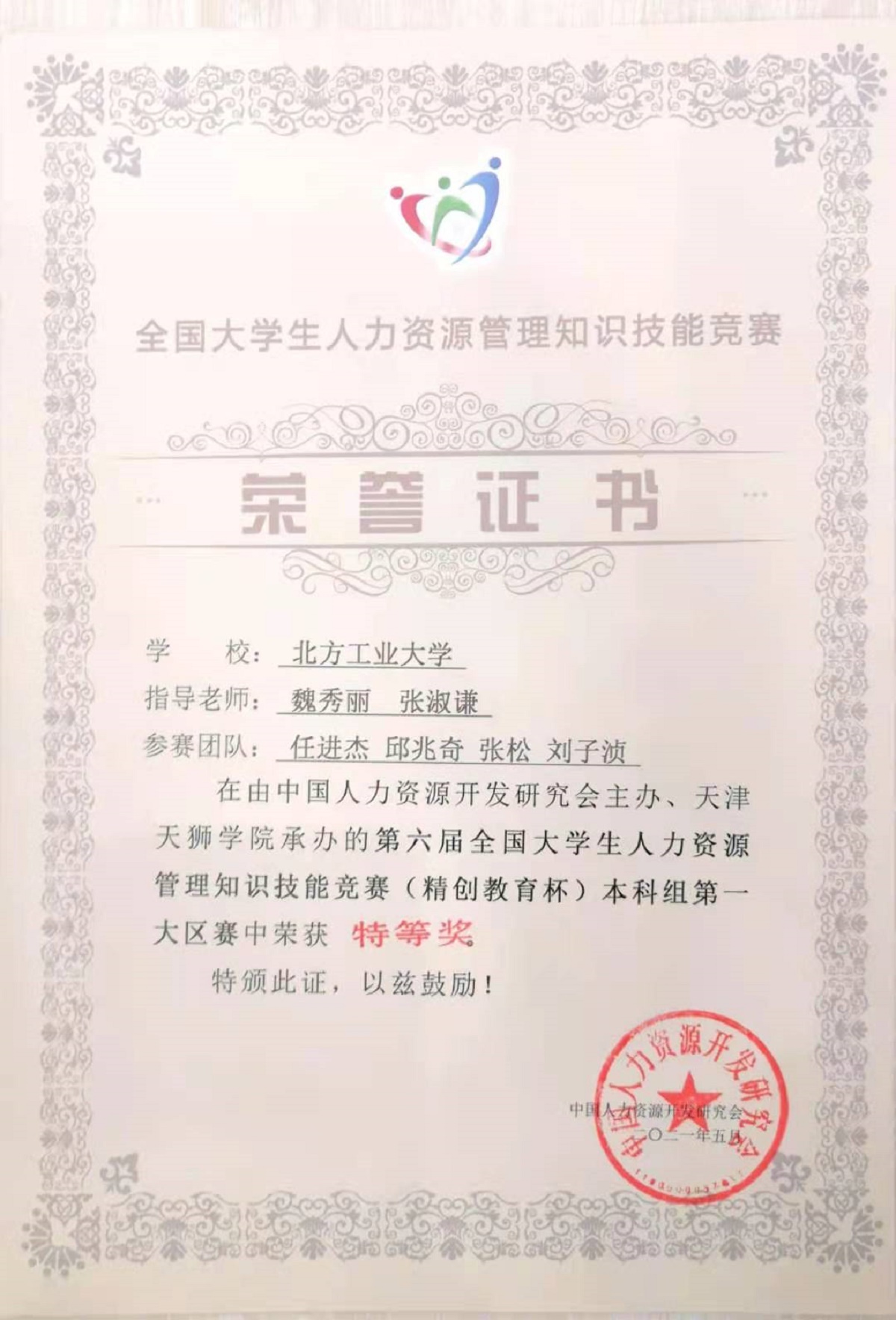 365英国官网365英国上市公司官网高度重视此项工作,通过组织全校范围内的选拔赛进行层层选拨,最后工商管理专业2018级的任进杰、邱兆奇、张松、刘子浈4位同学脱颖而出,代表学校参加大区赛,并由工商管理系魏秀丽、张淑谦两位老师全程参与指导。最终,在经过1个小时的理论知识考评和12个小时的人力资源管理智能仿真与竞赛对抗后,365英国上市公司官网队在激烈的竞争中以小组第一的成绩获得第一大区赛的特等奖,成功晋级全国总决赛。
