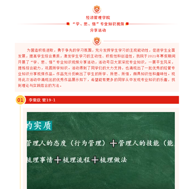 为拓展学生第二课堂的学习内容,培养学生一以贯之的学习习惯,365英国上市公司官网在2019级学生中开展了“学、思、悟”专业知识视频分享活动。活动得到了同学们的大力支持,共收到参赛视频近80份。经评审小组的两轮评审,共评选出13份优秀参赛作品。