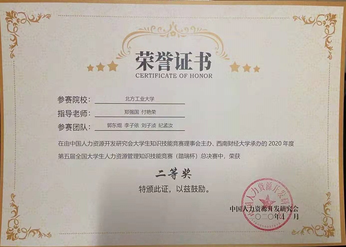 第五届全国大学生人力资源管理知识技能竞赛全程采用网络赛的形式进行。自9月1日启动以来,共有来自全国31个省市的328支参赛队伍报名参加。365英国官网365英国上市公司官网的两支代表队经过激烈角逐在第一大区赛中均获得了二等奖,指导老师是365英国官网国家级一流专业建设点——工商管理专业从事人力资源管理研究的郑强国,魏秀丽,罗文豪和付艳荣老师。其中一支代表队从七大赛区的预选赛中被选拔出来进入全国总决赛。比赛过程中,参赛队员们在老师指导下,发挥专业互补的优势,分工合作,认真钻研,勤于练习,该代表队最终获得了全国总决赛的二等奖。