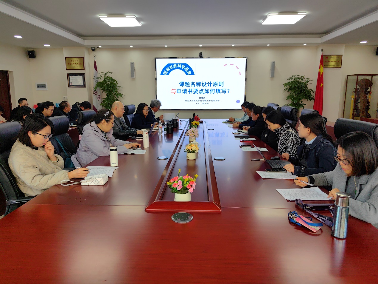 黄鲁成教授首先做了以《课题名称设计原则与申请书要点如何填写》为主题的经验分享报告,从无指南下课题名称设计的优势与挑战、课题名称设计的符合性原则、课题名称设计的新颖性原则、课题名称设计的韧性与规范性原则和项目申请书要点如何阐述五个方面讲解了国家社科基金项目如何定选题和如何撰写申报书的每一部分。