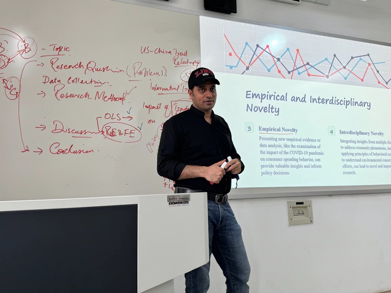 本次讲座中,Khurshid教授按照论文写作的主要流程,结合自己发表的顶级期刊论文,向同学们细致讲解了如何撰写一篇高质量的经济研究论文。他指出,首先要选择一个研究主题,在选择主题时要综合考虑自己的兴趣、目前的新兴趋势以及已有文献的研究空白等多个方面;其次,文献综述工作尤为重要,需要收集相关资料进行批判性的分析和系统性的总结,并以此为基础提出有效的研究问题和假设,他强调要注意评估问题的可行性。最后是设计实验方法,包括数据的收集和处理以及稳健性检验等内容。同时,Khurshid教授也向大家介绍了Canva等软件,强调了在论文中制作规范、科学、严谨图表的重要性。在讲座最后,Khurshid教授耐心回答了同学们提出的在论文写作过程中遇到的问题,对同学们正在撰写的论文进行了针对性的指导。