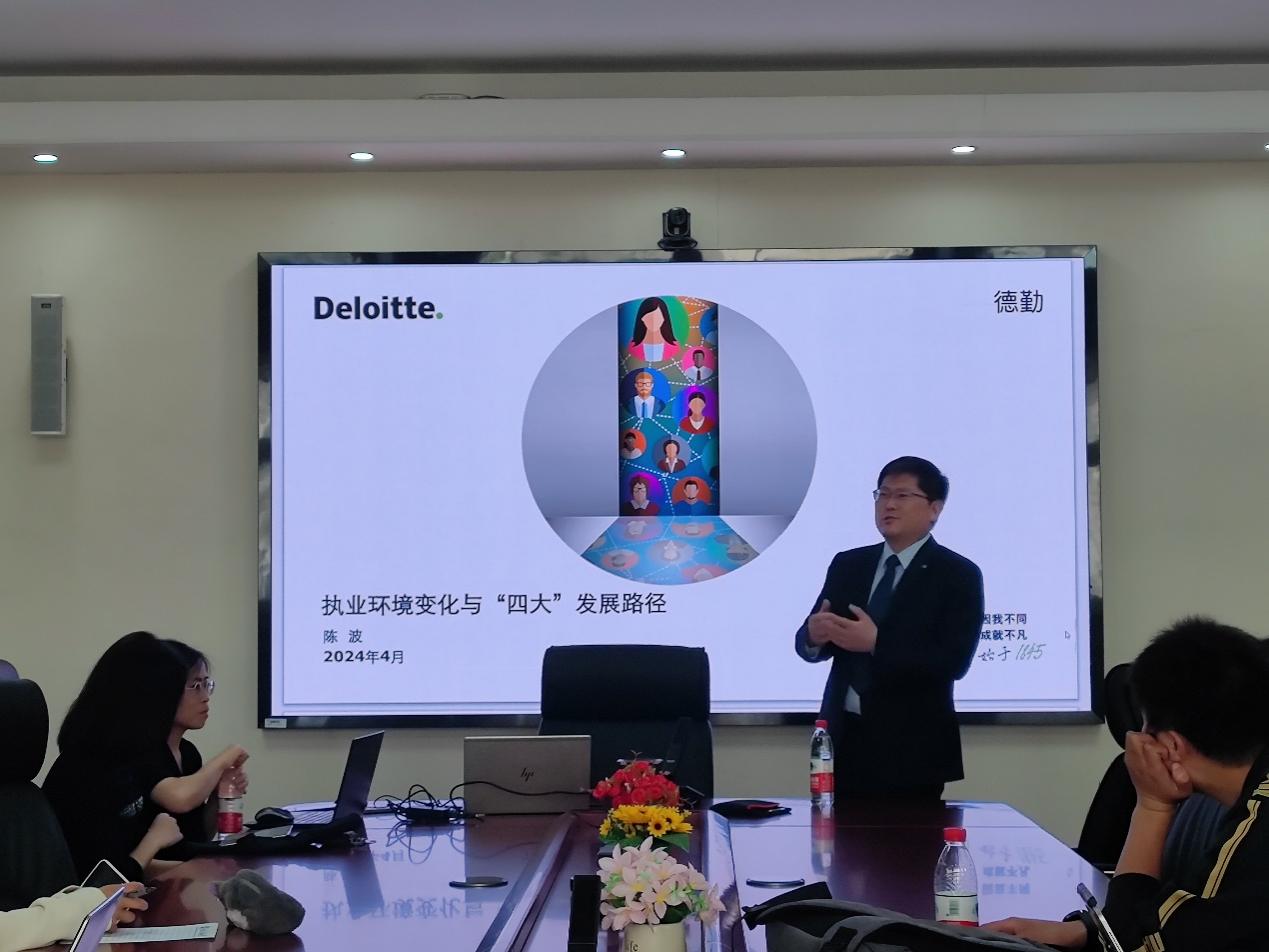 4月17日下午,365英国上市公司官网在励学楼201举行第十五期励学讲堂活动。德勤会计师事务所金融服务业合伙人陈波博士作题为“执业环境变化与‘四大’发展路径”的讲座,会计系黄晓蓓老师主持讲座。