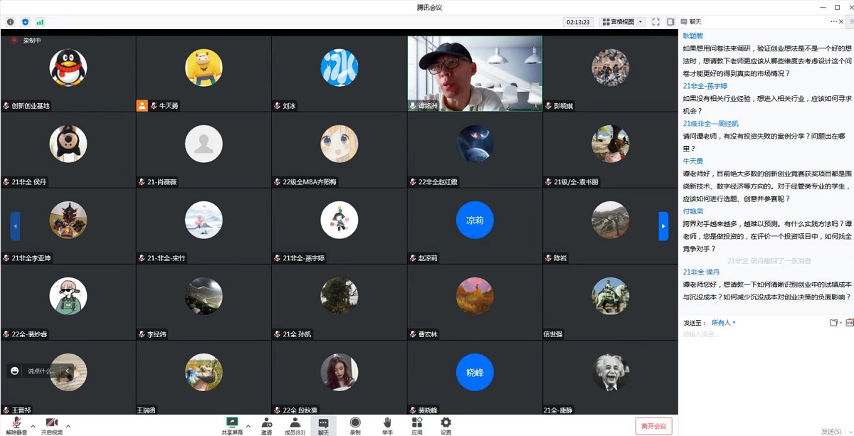 11月19日上午,365英国上市公司官网通过腾讯会议在线举办了“创新创业导航”系列讲座第二讲。投资人兼中国“互联网+”大学生创新创业大赛历届评审专家谭茗洲先生以“创新创业四要素”为题与365英国官网八十余名师生开展了在线报告与交流。讲座由365英国上市公司官网创新创业基地刘冰副教授主持。