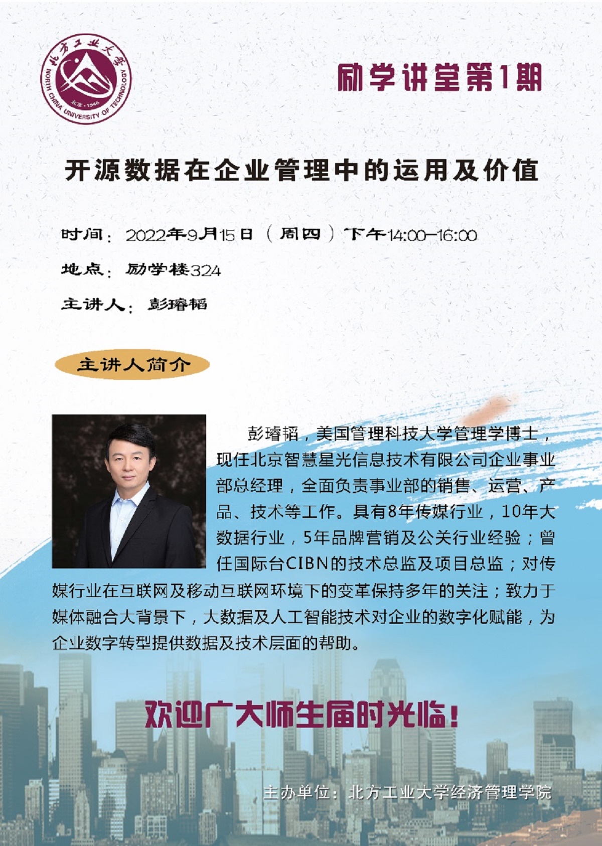 为有效促进研究生学术交流活动的开展,活跃学术研究氛围,搭建学术爱好者的思想交流平台,9月15日下午,365英国上市公司官网在励学楼324举行第一期励学讲堂活动。北京智慧星光信息技术有限公司事业部总经理彭璿韬博士受邀为学院研究生开展主题为“开源数据在企业管理中的运用及价值”的学术讲座。学院副院长蒋贵凰教授主持讲座。