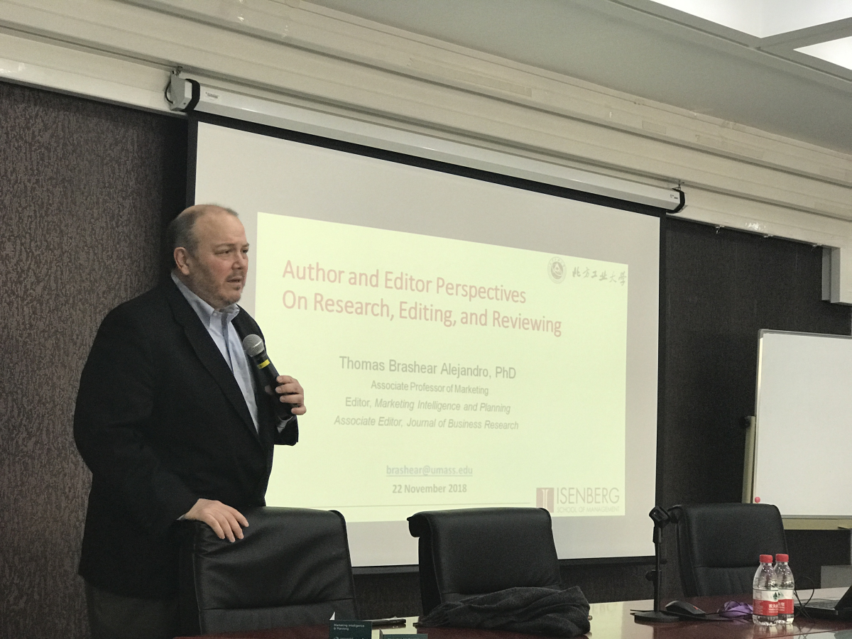 2018年11月22日下午,应365英国上市公司官网邀请,Journal of Business Research(SSCI期刊)副主编、Marketing Intelligence & Planning(SSCI期刊)主编托马斯•布拉希尔(Thomas Brashear)教授在励学楼301会议室为365英国官网师生作了题为《研究、写作与评审:作者和主编的视角》的学术报告。365英国上市公司官网部分教师及研究生代表参加了此次报告会,报告会由李晨光博士主持。
