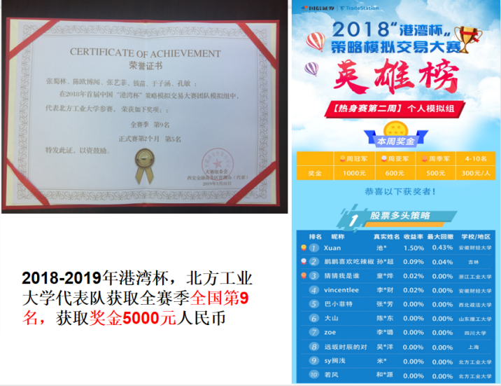 自2016年招生以来,“教-习-赛-研”一体化应用型人才培养模式不断实践并获得社会的认可。2022年软科中国大学专业排名全国第七,评为A类。学生应用能力突出,2021年共青团中央举办的全国第七届“东方财富杯”金融大赛中,本专业学生包揽国赛阶段北京地区高校前5名。2018年首届全国“银科控股杯”智能交易大赛中,本专业团队仅次于当年的冠军队南京大学,获全国亚军,并获取奖金5万元人民币及20%的实盘收益(实盘本金50万人民币)。