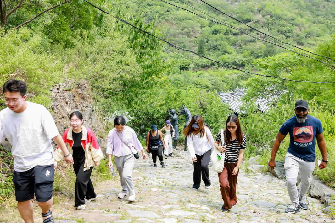 接着,在讲解人员的带领下,中外学生们一同徒步京西古道,沿途了解古道的历史与文化,在铁匠铺、马蹄窝、牛角岭关城等历史文化景点前驻足参观,亲身感受千年古道的沧桑与魅力。同学们感慨道,这样古老而有意义的道路就像一本活的历史书,展现着这条古道岁月的变迁。