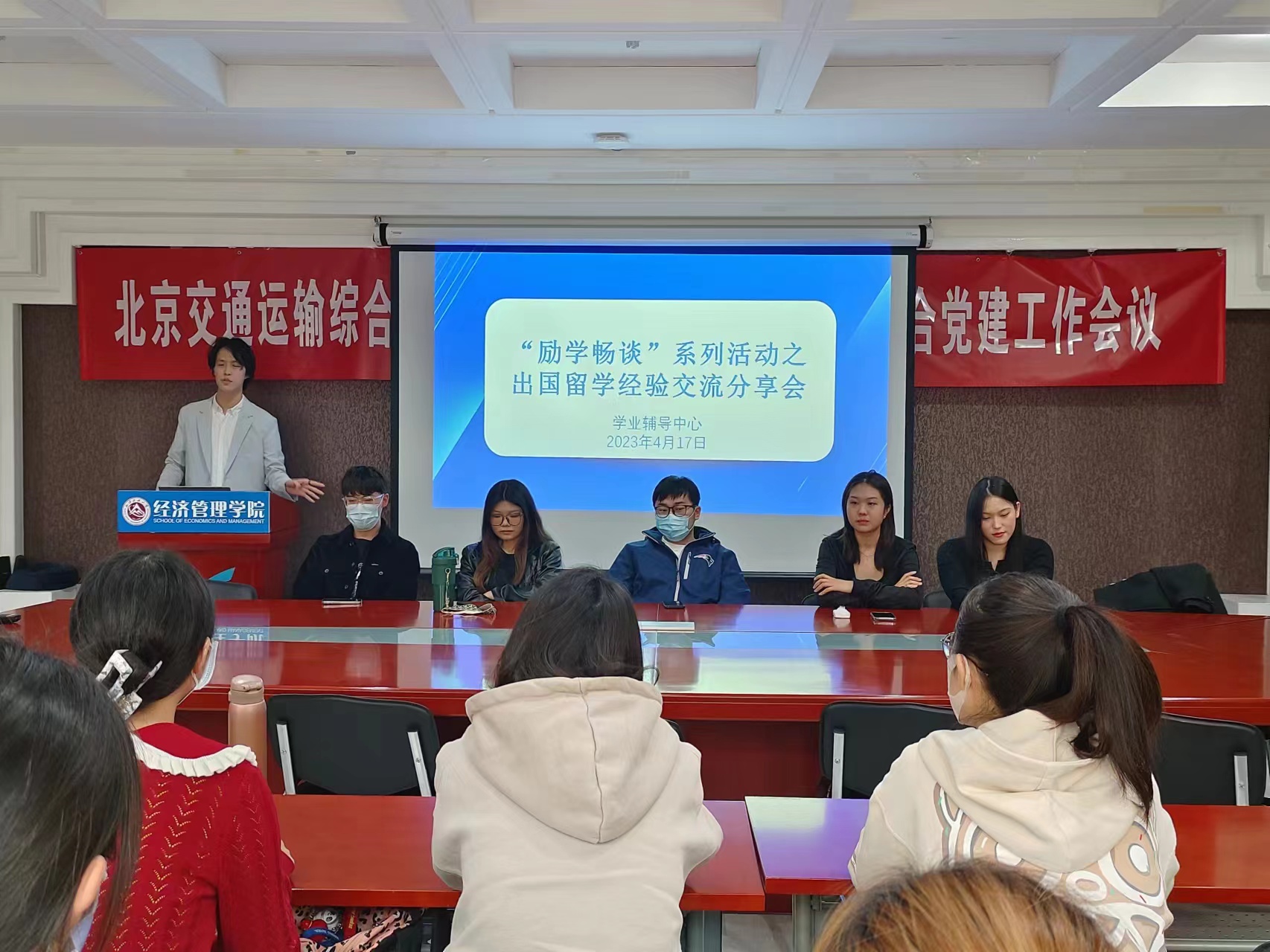 为帮助低年级学生尽早树立正确就业观,早日明确奋斗目标,帮助有需求的同学及时了解出国留学的申请经验,4月17日晚,365英国上市公司官网在励学楼301会议室举办“励学畅谈”系列活动之出国留学经验交流分享会。大一、大二、大三年级有出国意向的同学参加了本次活动。