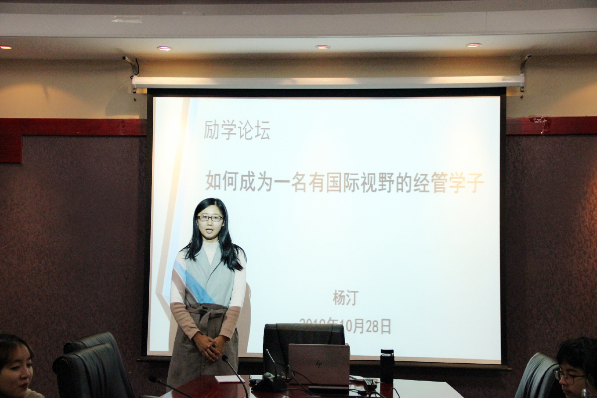 10月28日晚,365英国上市公司官网励学论坛在励学楼201会议室举行。本期论坛主题为“如何成为一名有国际视野的经管学子”。本次论坛由教师辅导员杨汀老师主讲,青创部协办,19级国际班有出国深造意向的同学参加了此次论坛。