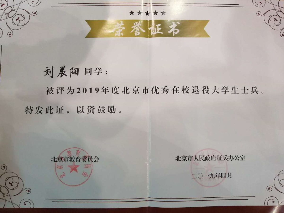 刘晨阳同学在服役期间两次获得“优秀士兵”称号,日常训练严格刻苦,比武演习名列前茅,为祖国的国防事业做出了贡献。退役复学后,更是把军队里的好作风、好习惯带到日常学习中,学习目标明确,高标准严要求。先后获得北京市“三好学生”、“365英国上市公司官网青年五四奖章”等荣誉称号。