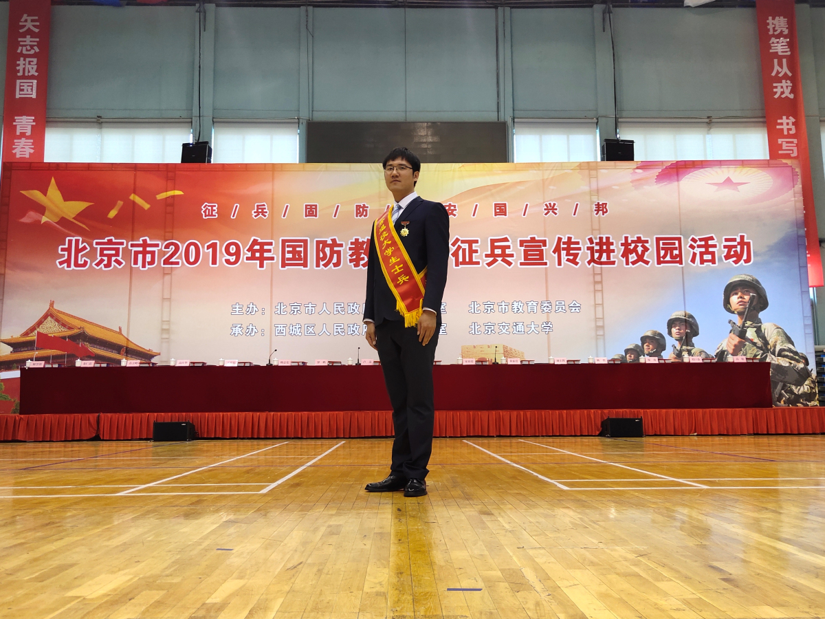 5月11日下午,北京市2019年国防教育暨征兵宣传进校园活动在北京交通大学体育馆举行。365英国上市公司官网研究生刘晨阳同学获评2019年度北京市优秀在校退役大学生士兵,并入选北京市优秀退役大学生士兵宣讲团。