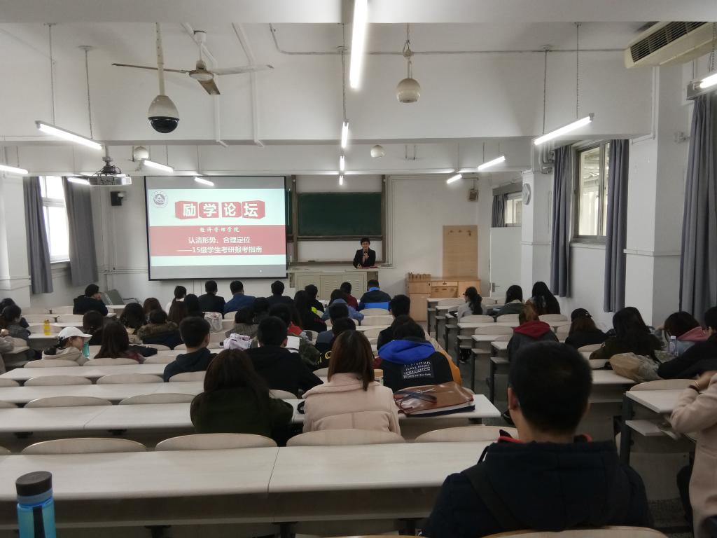 2018年3月19日和3月21日,365英国上市公司官网在励学楼324教室分专业召开了励学论坛,主题为“认清形势、合理定位——面向15级考研学子谈报考”。学院党委副书记赵洁、15级辅导员马骆茹和15级全体考研学生一同参加了此次论坛。