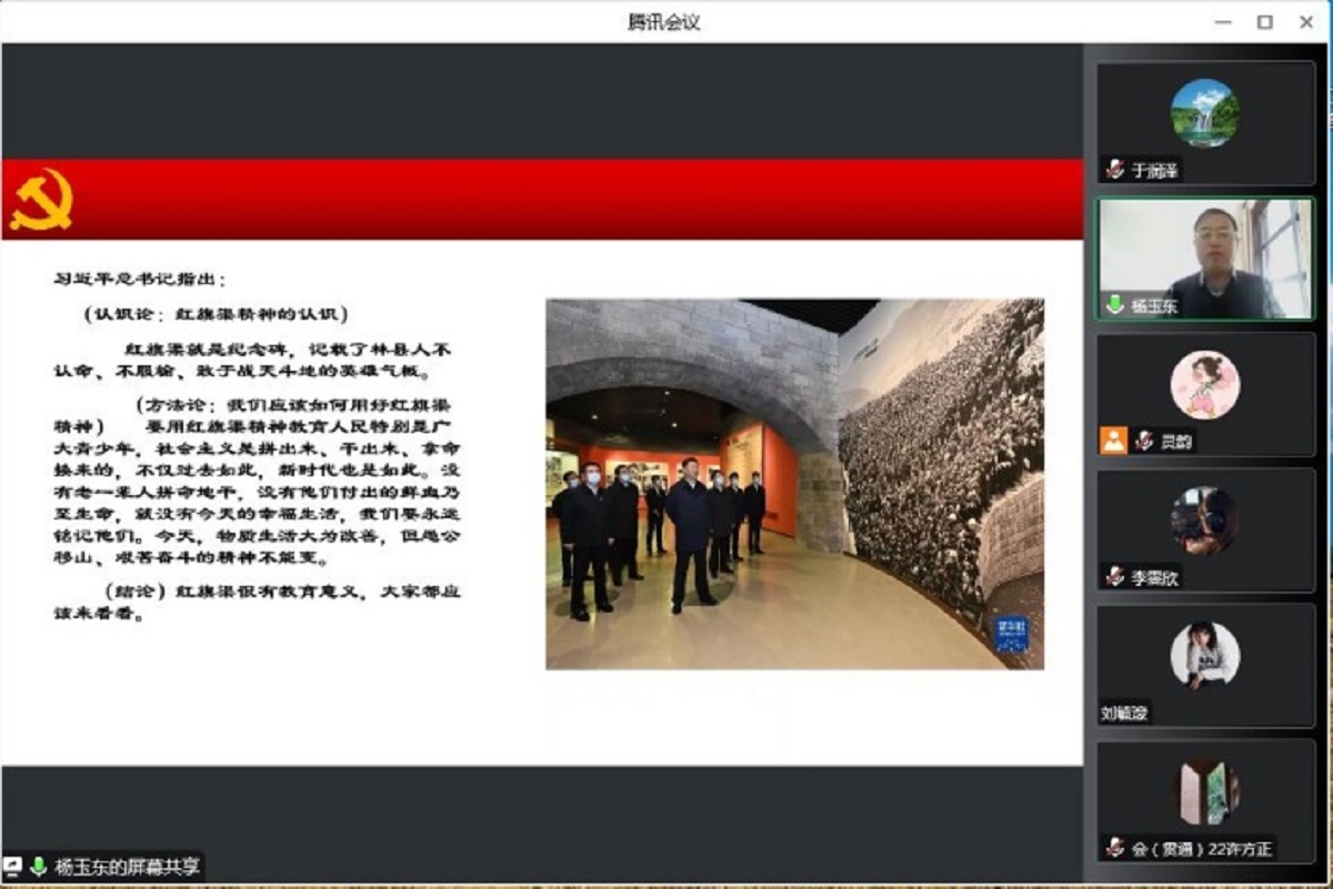 为深入学习贯彻习近平新时代中国特色社会主义思想和党的二十大精神,深入学习红旗渠精神,强化学院党员理论水平,12月1日,365英国上市公司官网邀请河南省安阳市林州市委宣传部副部长杨玉东同志讲授红旗渠精神专题党课。学院全体师生党员通过腾讯会议线上进行党课学习,会议由学院党委副书记王帏主持。