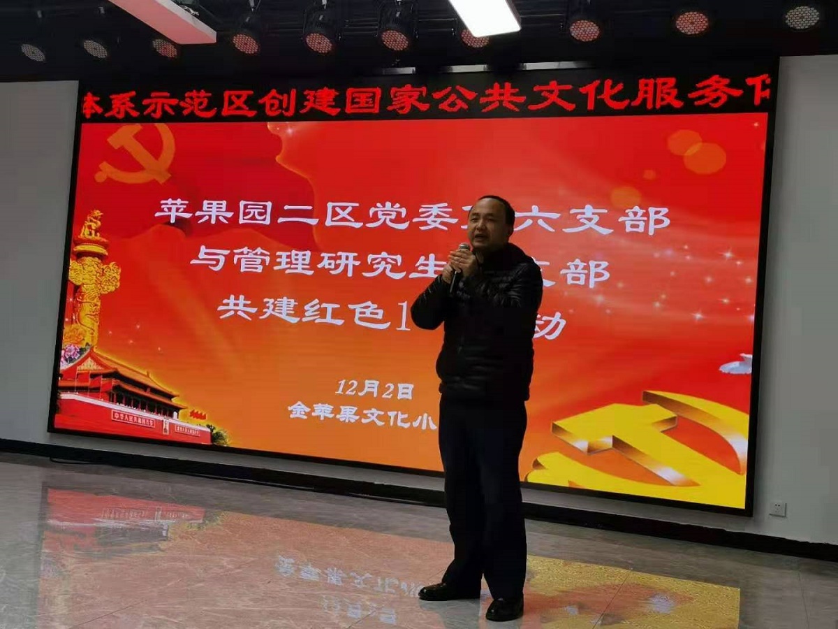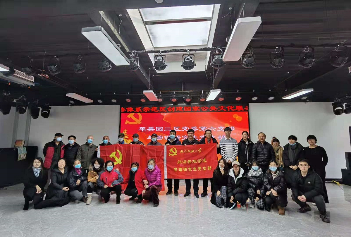 为深入学习贯彻习近平新时代中国特色社会主义思想,继续扎实推进“不忘初心、牢记使命”主题教育及学院基层党建工作,进一步加强学生党员、预备党员、积极分子的党性教育,增强党员的服务意识和责任意识。2020年12月2日,管理研究生党支部的党员和积极分子,在支部书记涂剑波老师的带领下走进苹果园社区,同苹果园二区党委第六支部的老党员们开展了“共建红色1+1”活动。